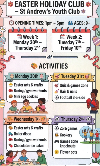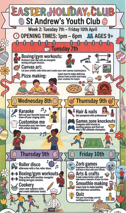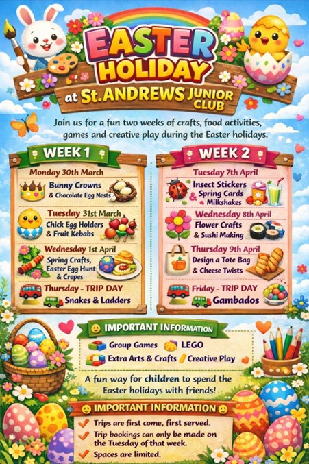 The Club's October Programme from 30th  March to the 10th of April See the list of all the exciting programs on offer below.  Senior Club 9+ is open door policy but you must be a member at the Club to take part. For Junior Club ages 5-9 you must book in advance by emailing info@standrewsclub.com