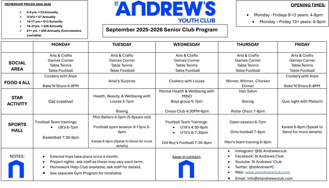 Senior Club is an open door policy for young people aged 9+ but you must be a member at St Andrew's. To sign up please click the followinglink